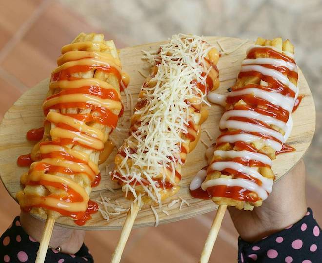 Jika di Indonesia dikenal sebagai hottang, di Korea Selatan jajanan hotdog berbalut kentang ini dikenal dengan nama Tokkebi Hotdog. Jajanan berbahan dasar sosis ini jadi salah satu jajanan favorit warga Korea. Tokkebi sama-sama terbuat dari sosis yang ditusuk lalu dibalut kentang dan tambahan keju mozzarella. Variasi hotdog ini juga langganan muncul di drama Korea, lho! Sungguh bikin ngiler sampai tak berdaya!